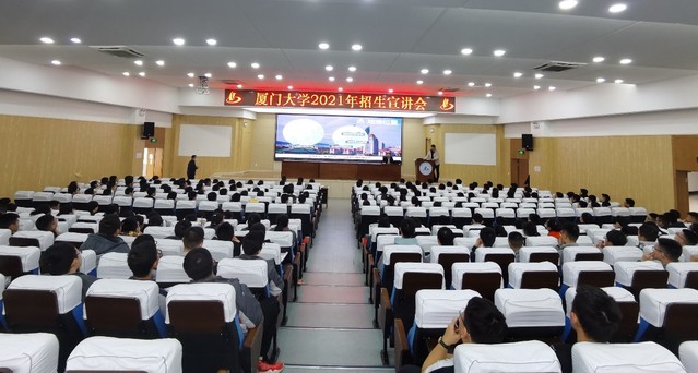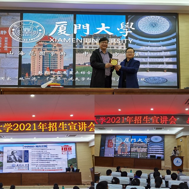 随后,招生宣传组一行来到瓯海中学举办厦门大学2021年招生宣讲会,近400名学生聆听了此次宣讲会。臧彧、俞显鸿分别向同学们介绍了厦门大学整体情况和创意与创新学院的基本情况,并诚挚欢迎他们报考,与厦门大学相约2021年百年华诞。毛通文代表学校向瓯海中学赠送校徽纪念品,瓯海中学负责人表示感谢,并期待与厦门大学继续保持密切联系,持续输送优质生源。