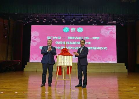 在随后举行的优质生源基地授牌仪式上,周大旺副校长与陈文强校长在千余名师生的见证下共同揭开“厦门大学优质生源基地”铜牌。这是厦门大学授予的第一块优质生源基地牌匾,同时也宣布了厦门大学优质生源基地授牌工作在全国范围内全面启动。