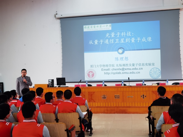 授牌仪式结束后,陈理想教授为中学生带来了科普讲座——《光量子科技:从量子通信卫星到量子成像技术》。他用 “中西古今”融会贯通的方式和风趣幽默的语言介绍了量子光学与量子信息领域的基本概念和核心技术,展示了厦门大学研究进展与前景,在引领同学们感受量子科技的精彩与魅力的同时,讲述了科学家们的爱国精神,激励学子们投身基础学科建设,为祖国发展贡献一份力量。