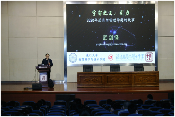 随后,天文学系武剑锋教授进行了题为《宇宙之王:引力——2020年诺贝尔物理学奖的故事》的专题讲座。武教授生动幽默地从牛顿万有引力定律故事引入,谈到爱因斯坦的广义相对论、霍金的宇宙大爆炸奇点存在理论、黑洞质量的测量,深入浅出地引领大家漫游人类认识引力、探索黑洞历史。讲座最后,武教授鼓励在座同学积极投身科学研究,勇攀学术高峰,将个人梦想和国家发展结合起来,现场掌声热烈,气氛活跃。