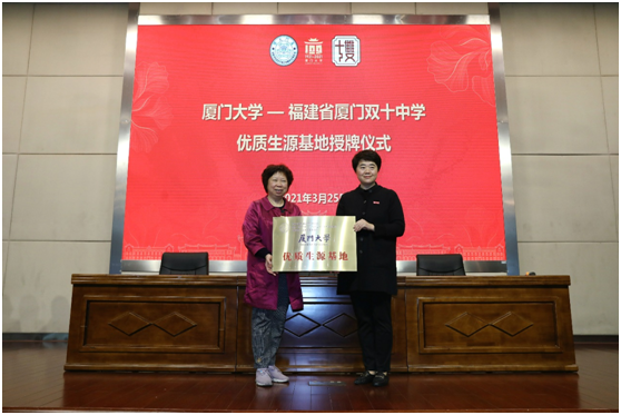 随后举行了厦门大学优质生源基地授牌仪式,刘艳杰主任与蔡芝禾副校长在师生的共同见证下,共同为“厦门大学优质生源基地”揭牌。