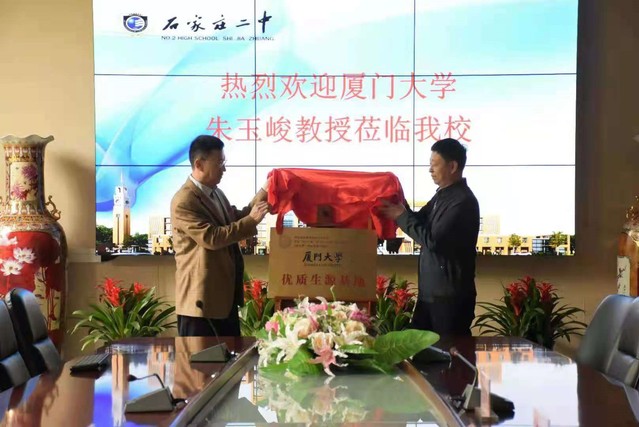 授牌仪式上,双方共同揭开“厦门大学优质生源基地”铜牌,我校向石家庄二中赠送了纪念礼物。