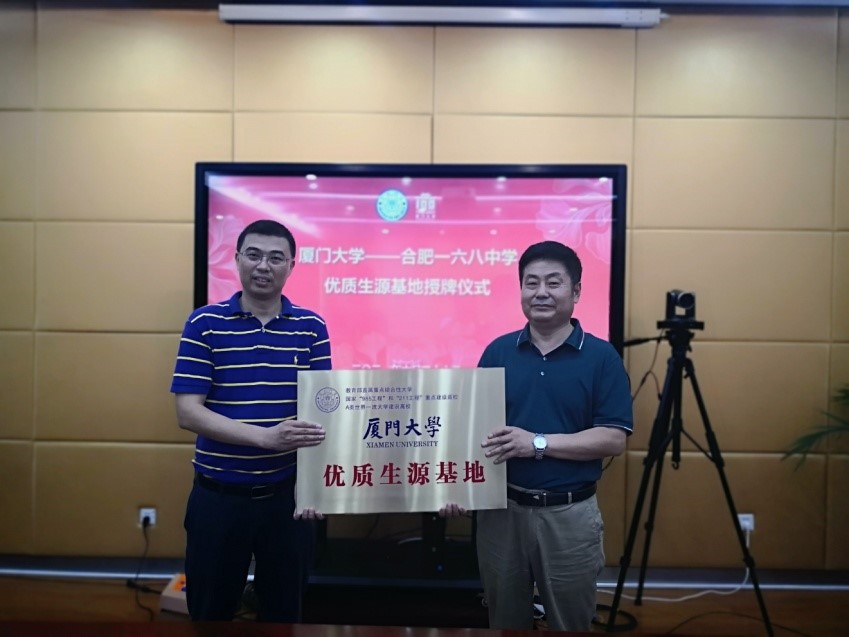 6月24日和26日,厦门大学安徽招生宣传组组长、药学院党委副书记杜超、闽江学者特聘教授李磊和能源学院辅导员施珩一行,分别走进安徽省阜阳一中和合肥一六八中学,举行厦门大学“优质生源基地”授牌仪式。