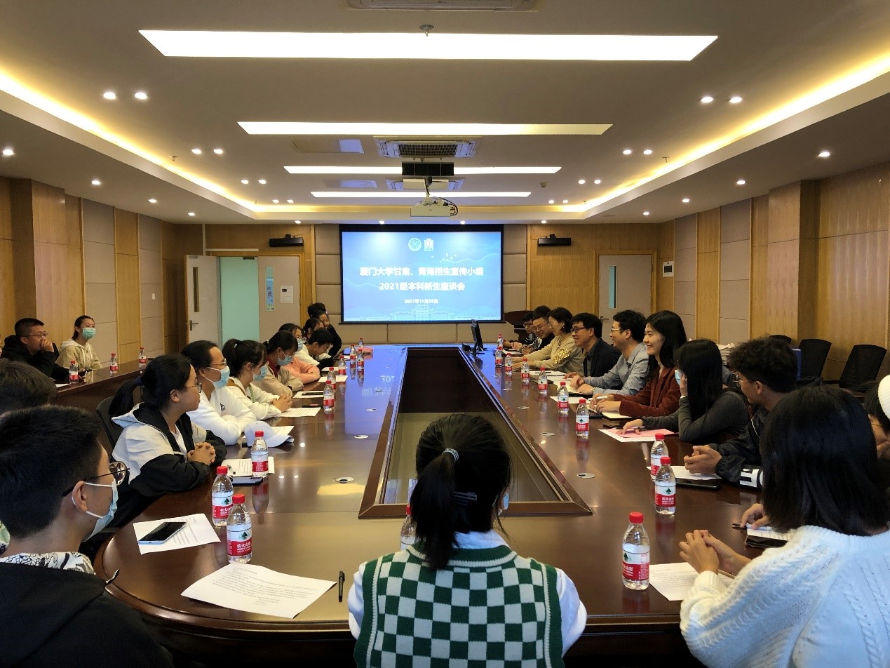 11月24日中午,厦门大学2021级甘肃、青海两省的新生代表座谈会在材料学院308会议室举行。校甘肃青海招生宣传组组长、继续教育学院党总支书记邱旺土,招生办副主任王晓萌出席了本次座谈会,与24名甘肃、青海省新生代表亲切交谈。招生办及甘肃青海招生宣传组相关成员参加了会议。会议由邱旺土主持。