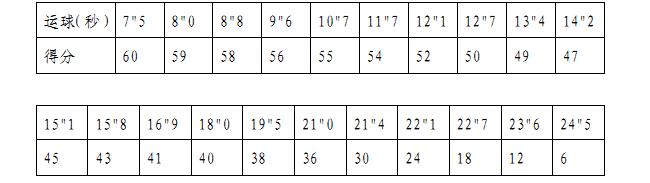 测试方法: 受试者在规定的区域内,将球射向球门,连续射10球,球的第一落点过球门线为有效。