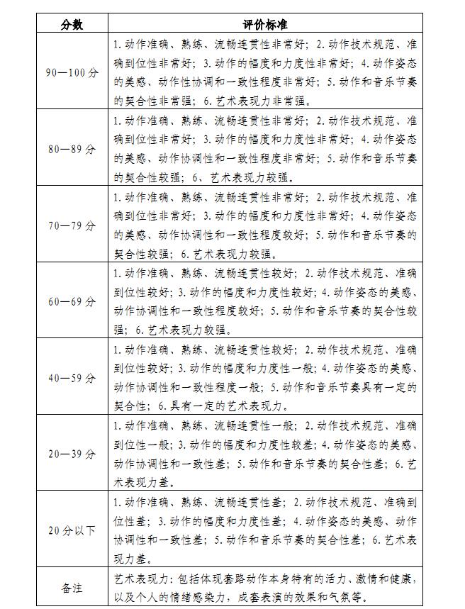 温馨提示:考生需自备考试伴奏音乐,着装最低要求是运动服,不得佩戴有碍于安全的任何饰物,不得完成有违安全的动作。