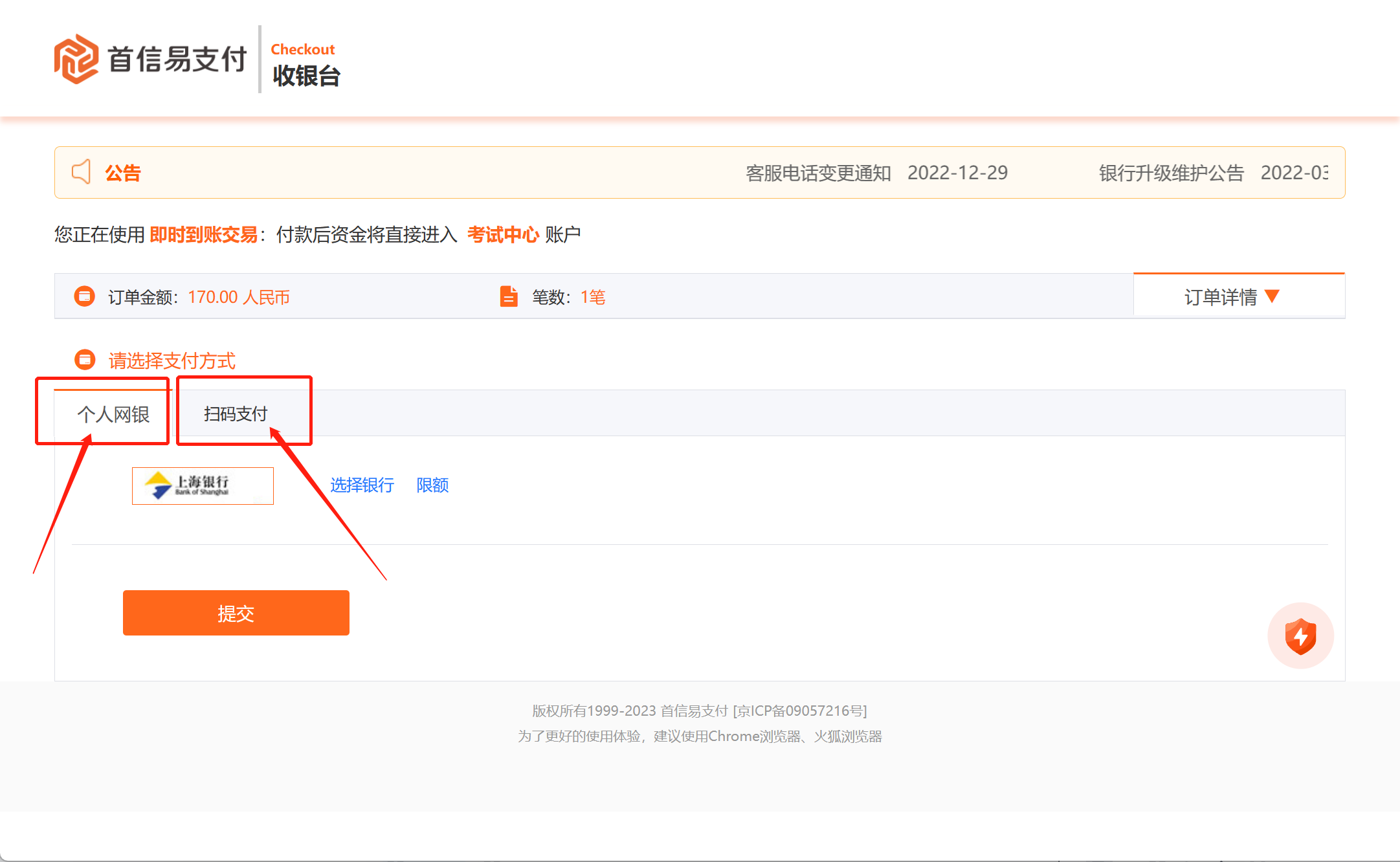 第五步:可通过个人网银、扫码支付两种方式进行缴费,支付后点击提交按钮。