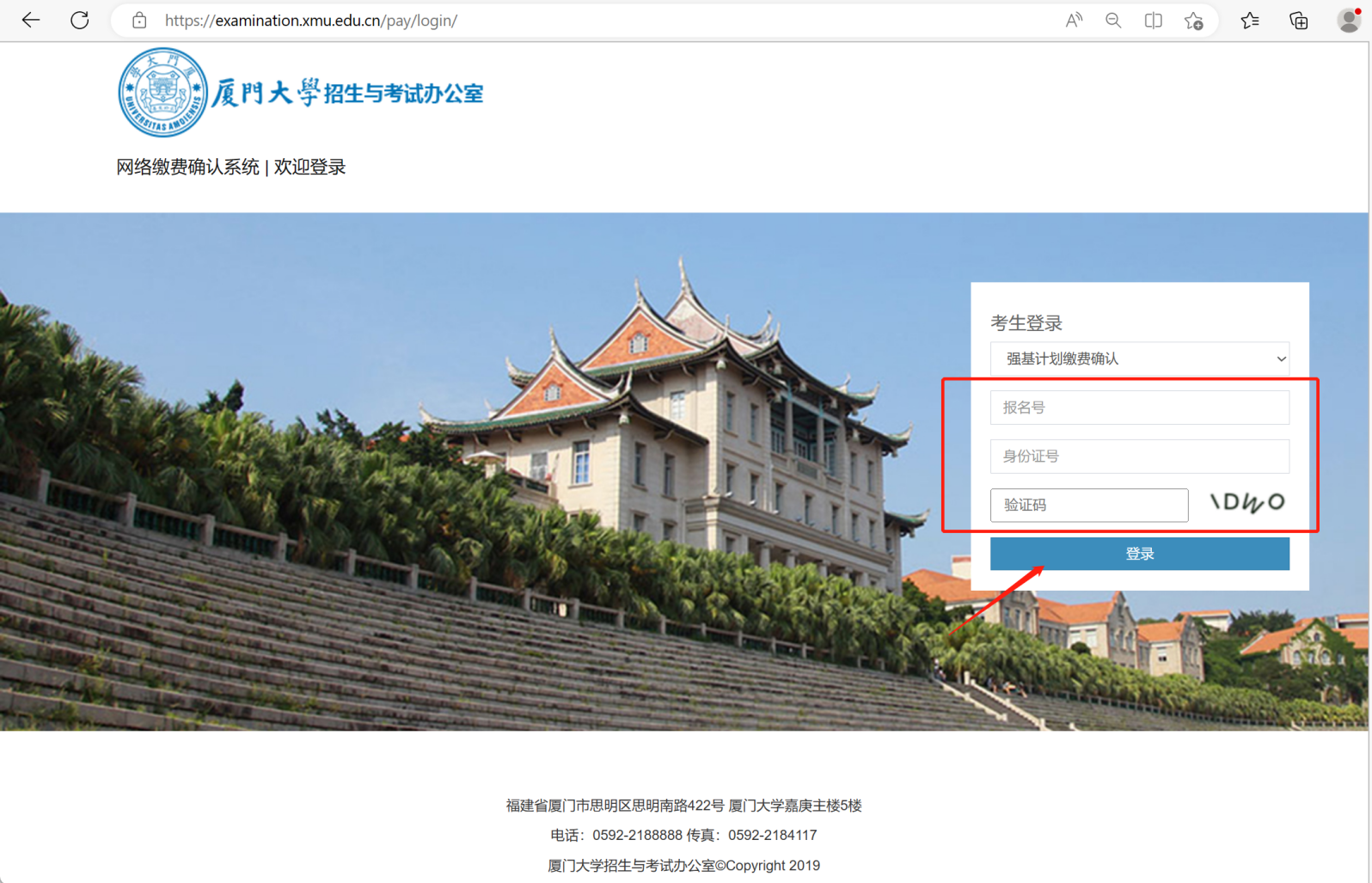 2.请考生凭强基计划报名号和身份证号登录我校缴费系统进行缴费。缴费网址:https://examination.xmu.edu.cn/pay/login/。缴费时间:5月2日9时至5月6日24时,逾期系统将关闭。
