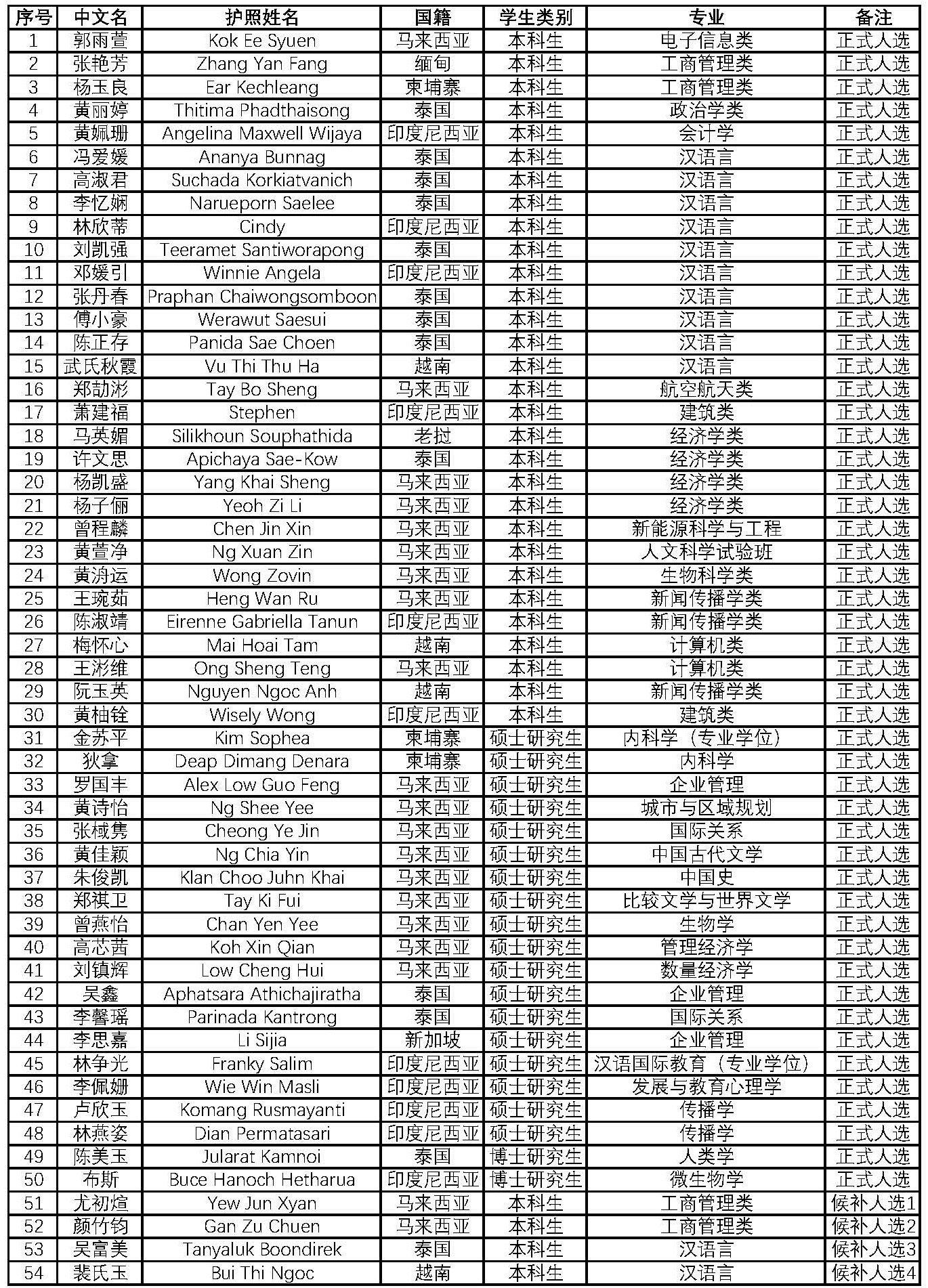1. 候补人选必须先以自费新生身份办理入学注册,并自行购买保险、足额交纳学费和校内住宿费等相关费用。开学2周后,如正式人选中有本科生放弃入学,候补人选可顺位递补、获得全额奖学金资助,届时学校将根据奖学金资助内容和学生已交费情况返还相关费用;如正式人选中无本科生放弃入学,候补人选需全程以自费生身份自行承担所有来华学习费用。
