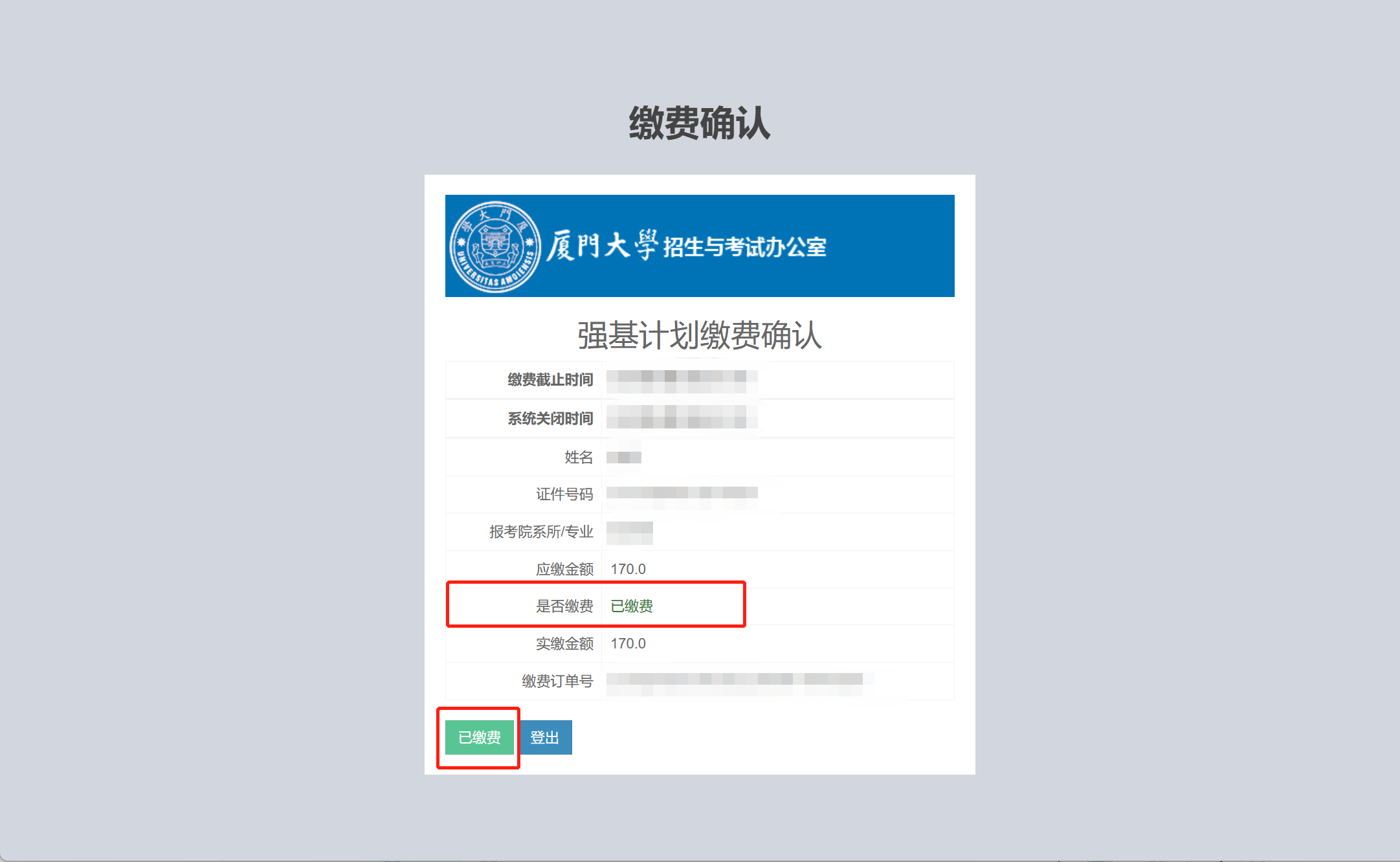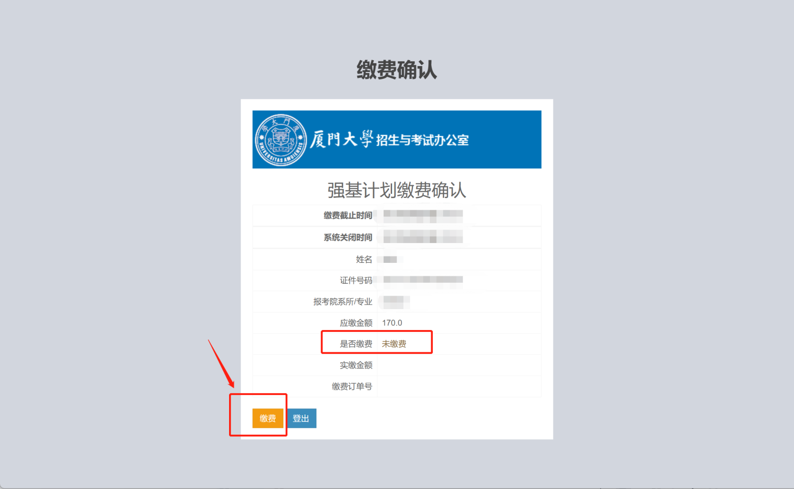 2.请考生凭强基计划报名号和身份证号登录我校缴费系统进行缴费。缴费网址:https://examination.xmu.edu.cn/pay/login/。缴费时间:5月2日9时至5月6日24时,逾期系统将关闭。