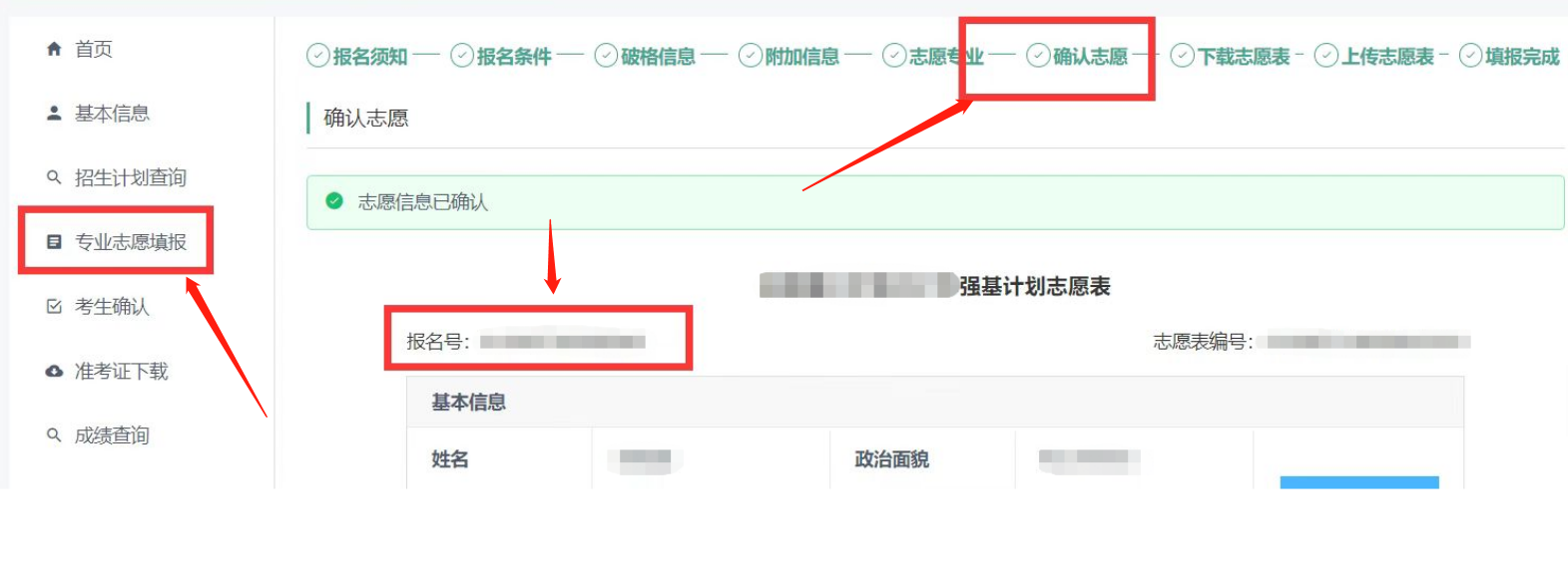 强基计划报名号查询方式:登录强基计划报名平台,左边菜单栏点击“专业志愿填报”,在确认志愿环节的强基计划志愿表上查看报名号。