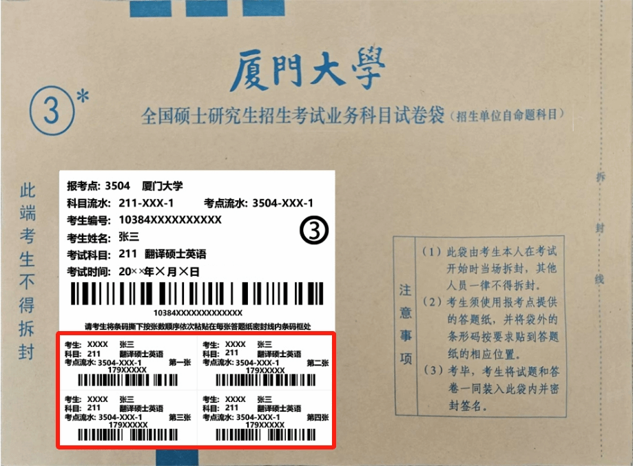 参加考试时,考场会发放自命题科目答题纸,其左上角设有条码粘贴区域,并且带有序号。同时,每位同学将会获得带有答题纸条形码的试题信封。