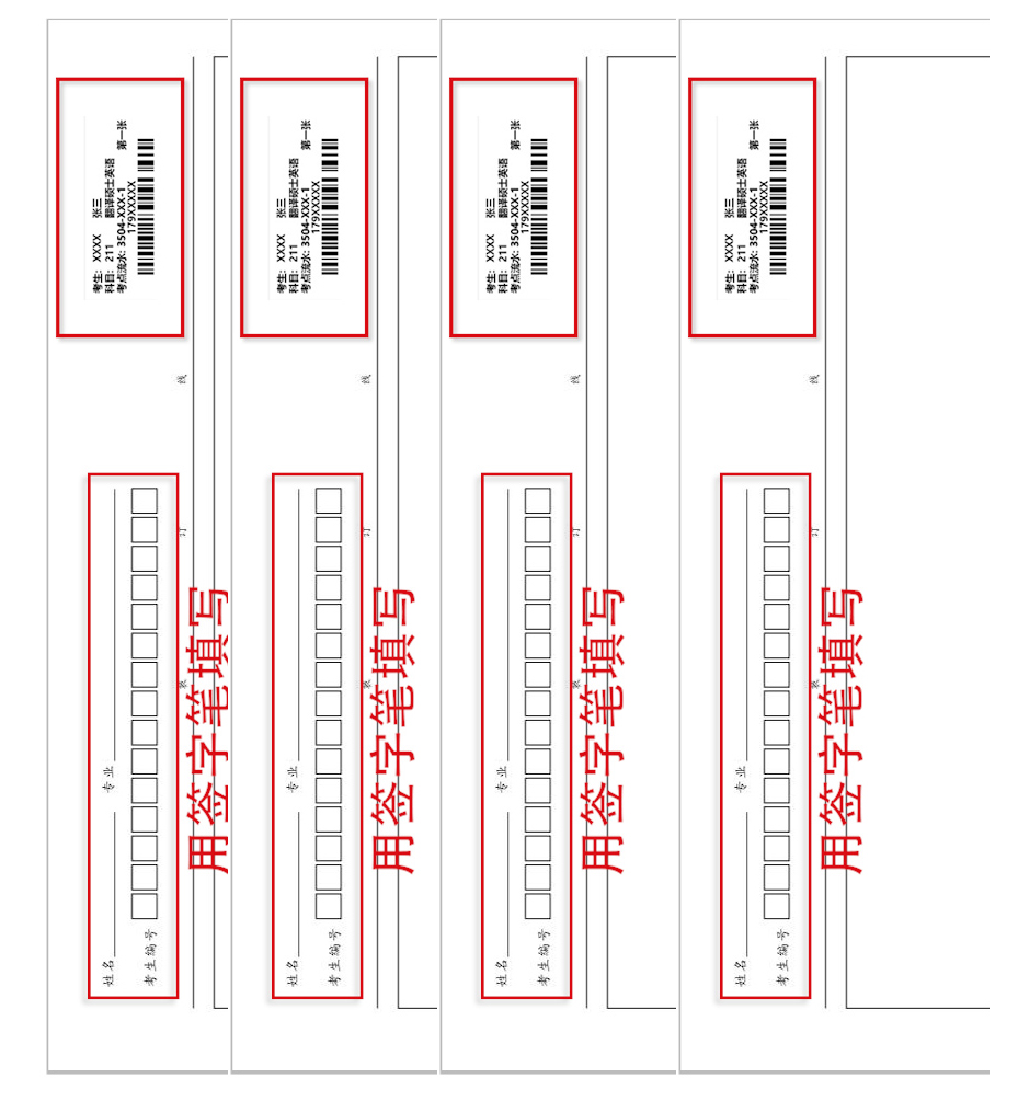 首先,请核对信封上条形码的个人信息,包括考生编号、姓名、考试科目等。如信息有误,请不要粘贴。确认无误后,再根据以下说明,将红色方框内条形码按编号顺序,粘贴在对应编号的自命题答题纸的条码粘贴区域。