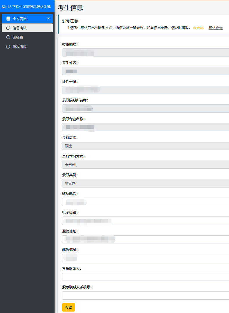4.若信息准确无误,点击页面上方的【确认无误】 按钮。如须修改联系方式,则点击【修改】,然后点击【提交】,最后点击【确认无误】方能生效。