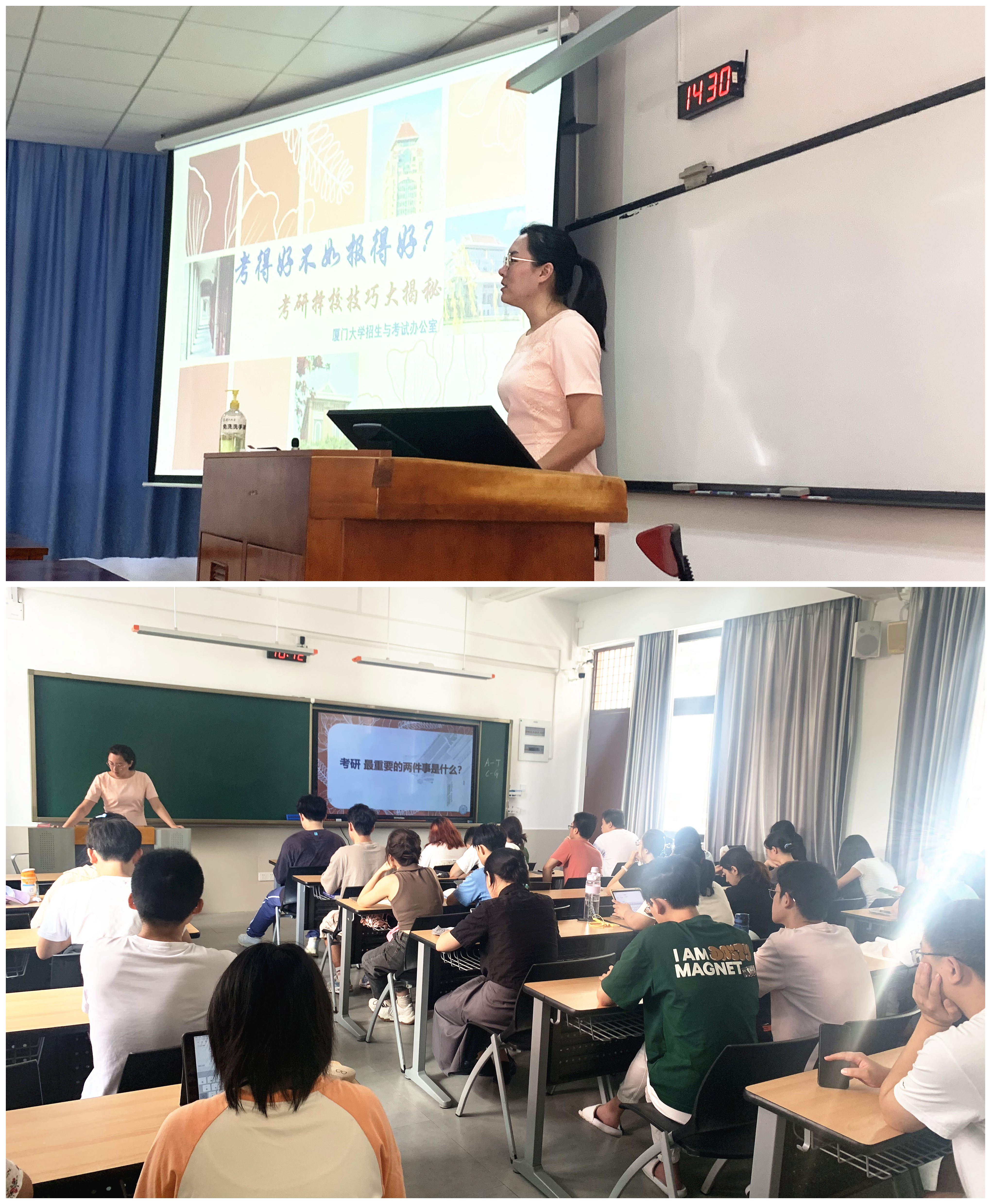 本次考研政策宣讲会从招生角度为大家分析了近年考研形势,解读高校研考招生政策,帮助同学们从宏观政策窥探报考技巧,从海量数据提取有效信息。以厦门大学的硕士统考招生为例,将考研初试、复试、调剂、录取四个重要环节串成线索,详细介绍了报考流程与各个重要节点,强调了同学们应通过搜集招生简章、专业目录、报录比等多方面的资料,更全面、准确地掌握目标院校专业的报考信息。